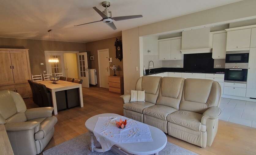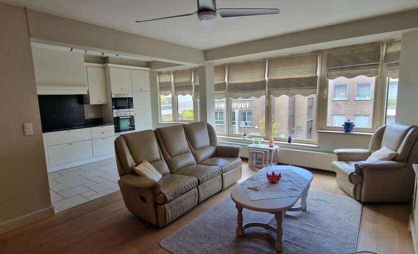 Via de lift komt u rechtstreeks in de inkomhal dewelke is voorzien van een vestiaire, ruime living met open keuken (voorzien van ijskast - oven, micro golf oven en arduinen aanrecht), handige wasruimte/berging, een badkamer voorzien van inloopdouche en één lavabo met meubel, 2 ruime slaapkamers (beide toegang tot het ruim aangenaam overdekt terras) en een apart toilet.