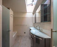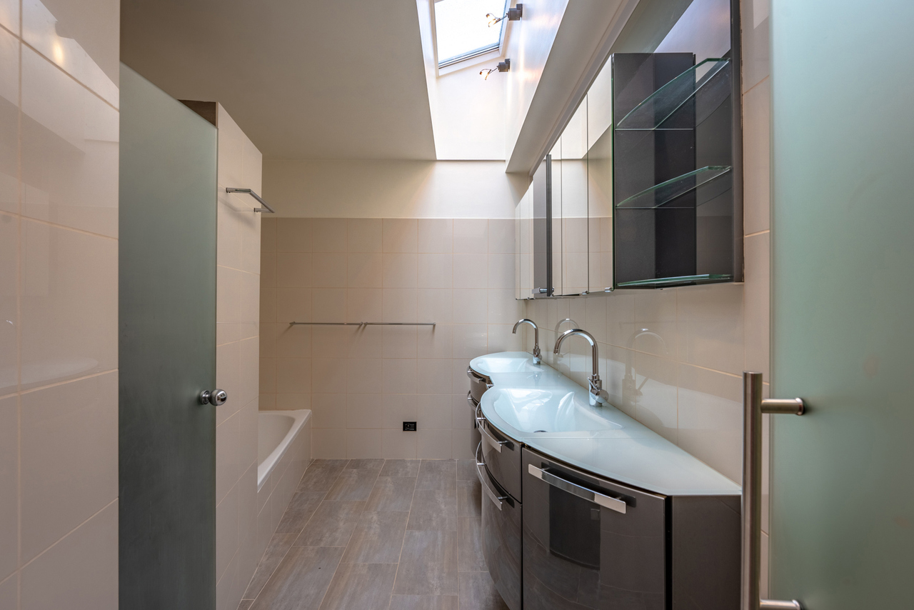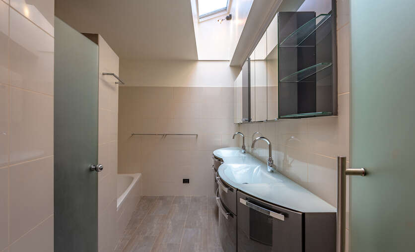 -de badkamer omvat een ligbad alsook douche, dubbele lavabo en kastruimte.