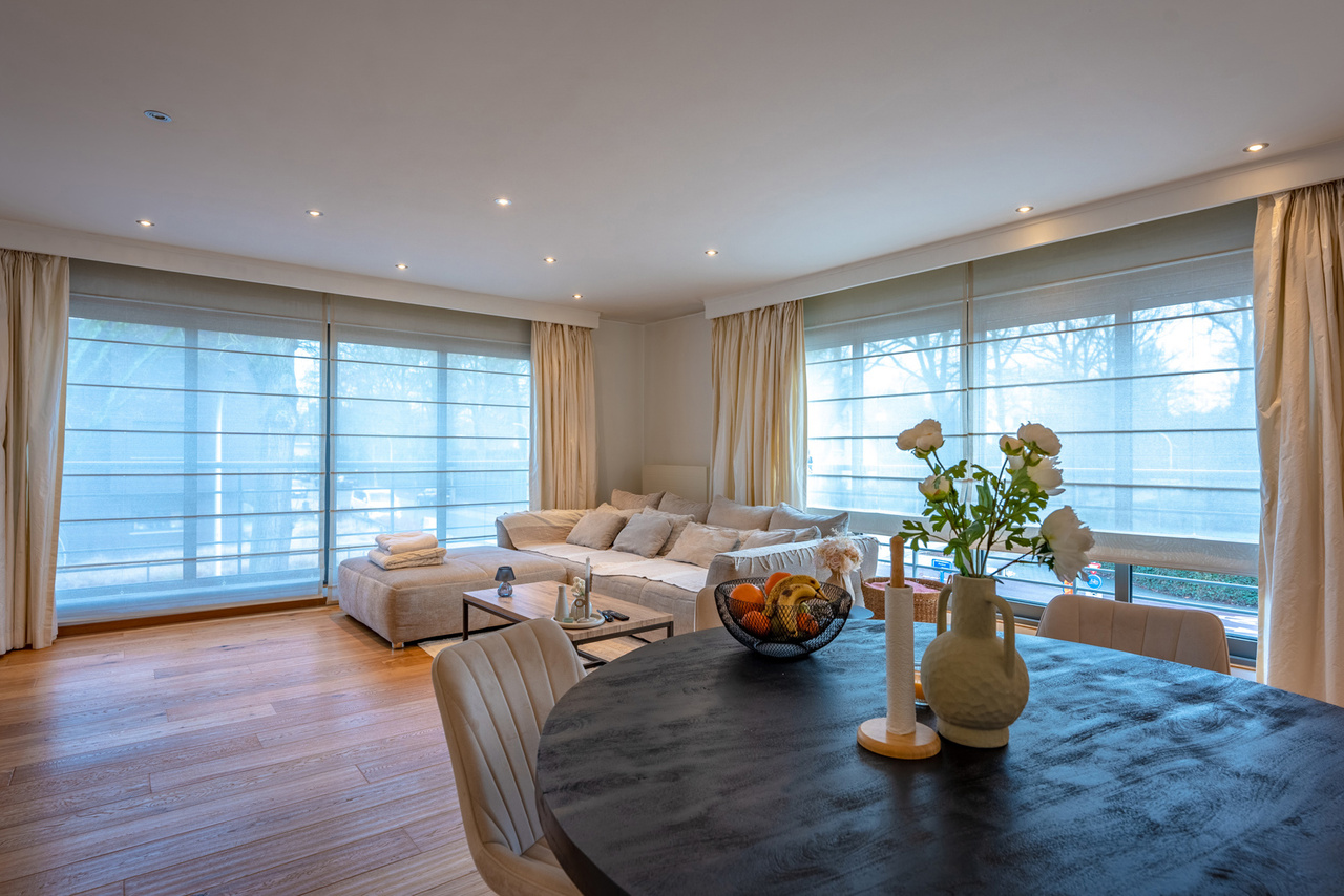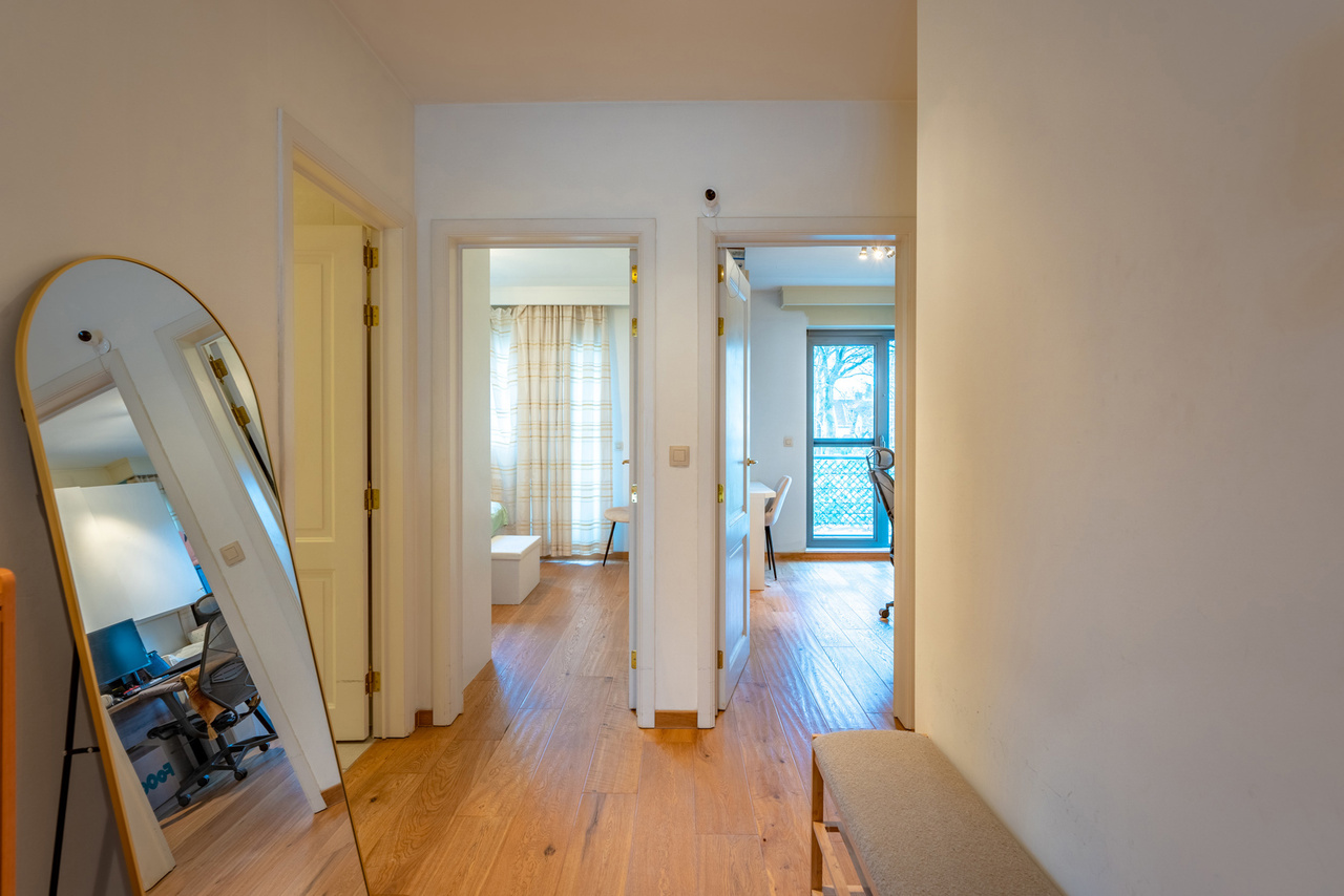 Middels de mooie gevelbreedte, de raampartijen vooraan en zijdelings geniet u van veel lichtinval en een ruimtelijk gevoel. Verder is het appartement voorzien van mooie doorlopende parketvloer.