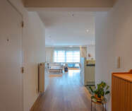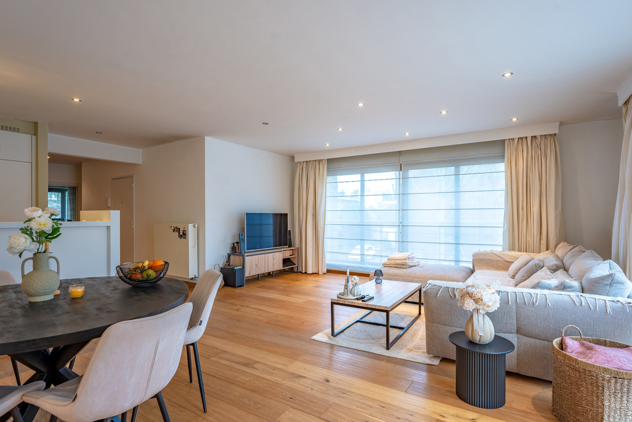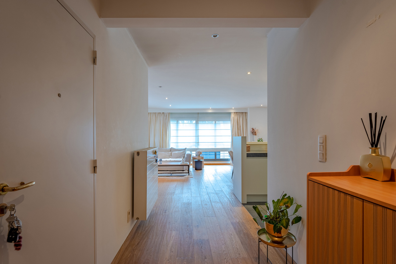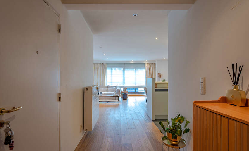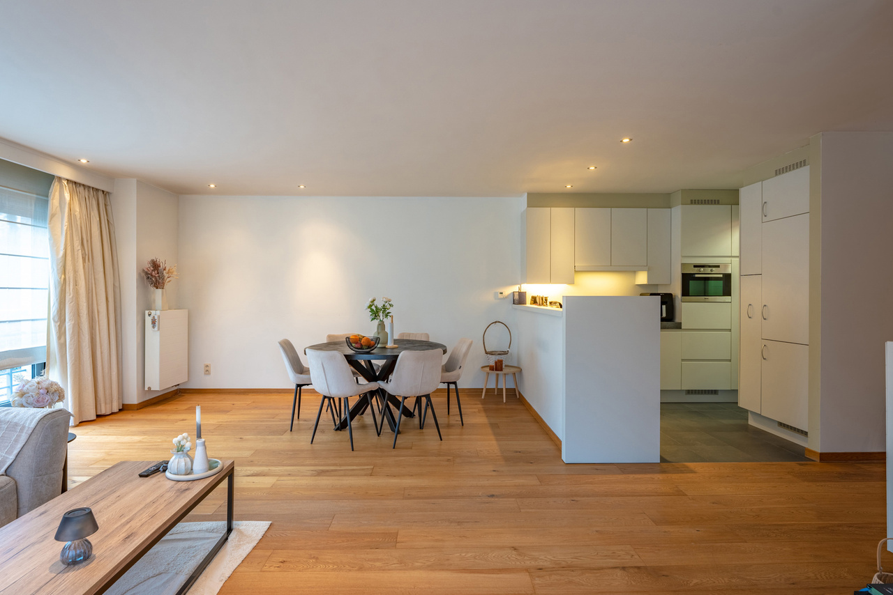 Inkomhal naar royale living (38m²) met open keuken (voorzien van inductievuur - ijskast - vriezer en vaatwasser) met naast gelegen berging/wasruimte, een badkamer en 2 slaapkamers.