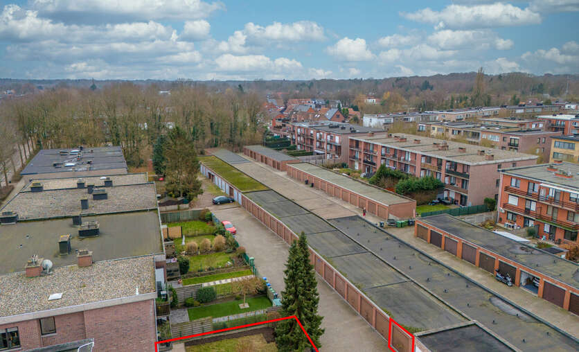Recht achter het gebouw een standaard garagebox met manuele poort.