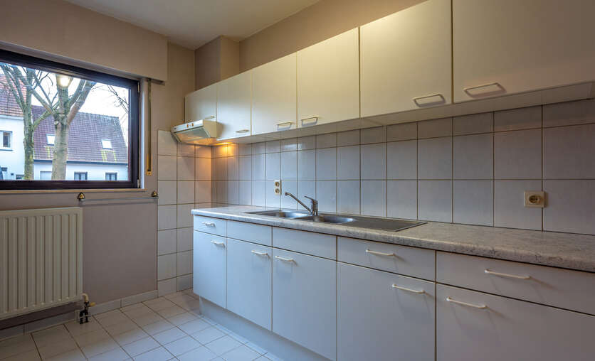 De keuken is gedeeltelijk ingericht, enkel gasfornuis en koelkast ontbreken.