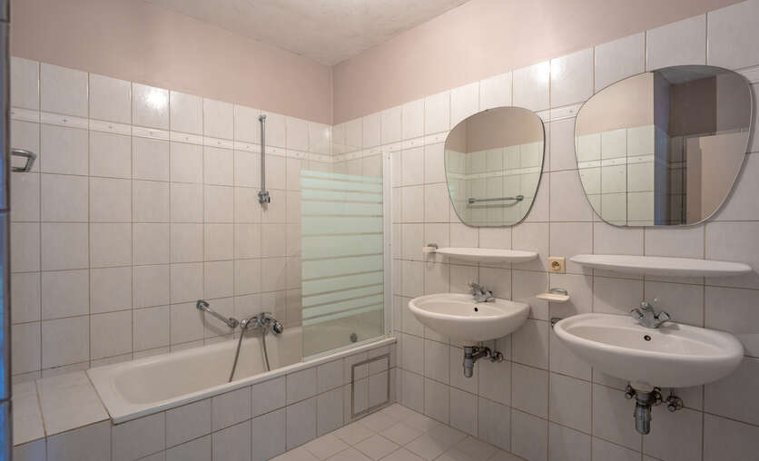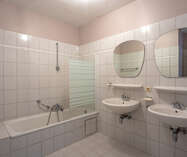 Badkamer met twee lavabo’s en een ligbad/douche.