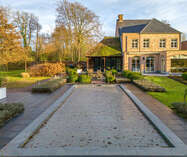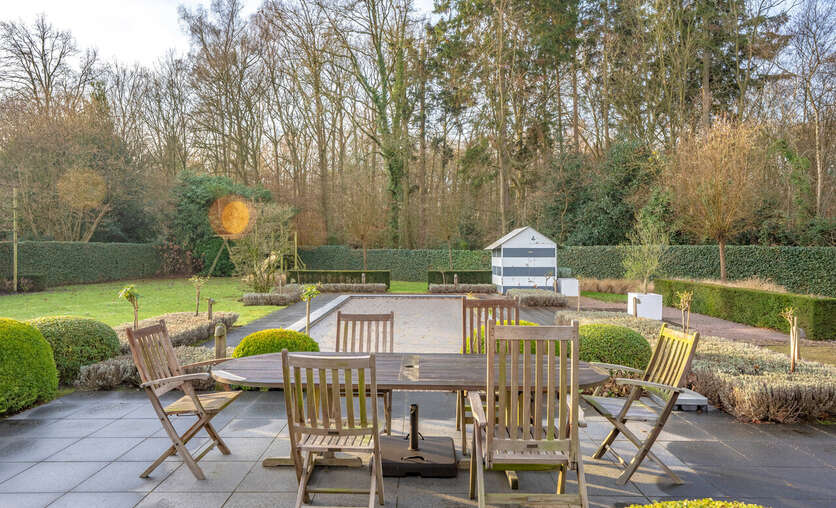 De volwassen tuin is mooi aangelegd en voorzien van een zonnig terras en zwembad (9 x 4) voorzien een rolluik.