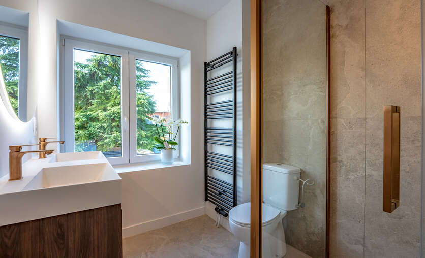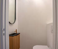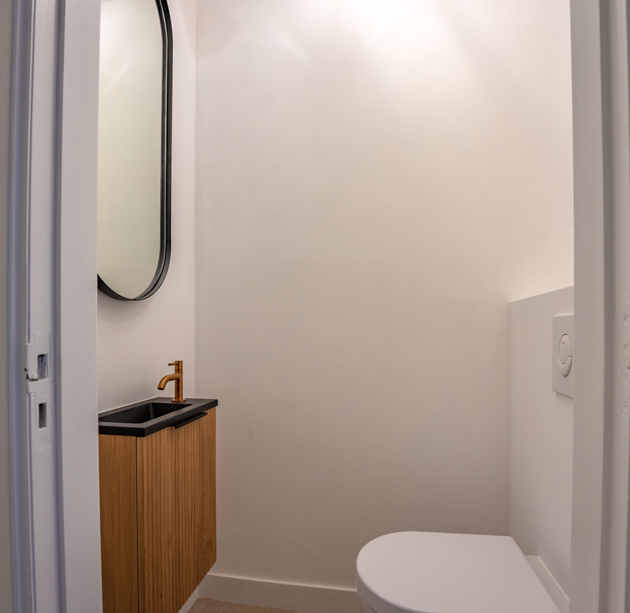 verdiep: drie slaapkamers (15m² - 14m² & 7,5m²) en een nieuwe badkamer voorzien van douche, toilet en dubbele wastafel.