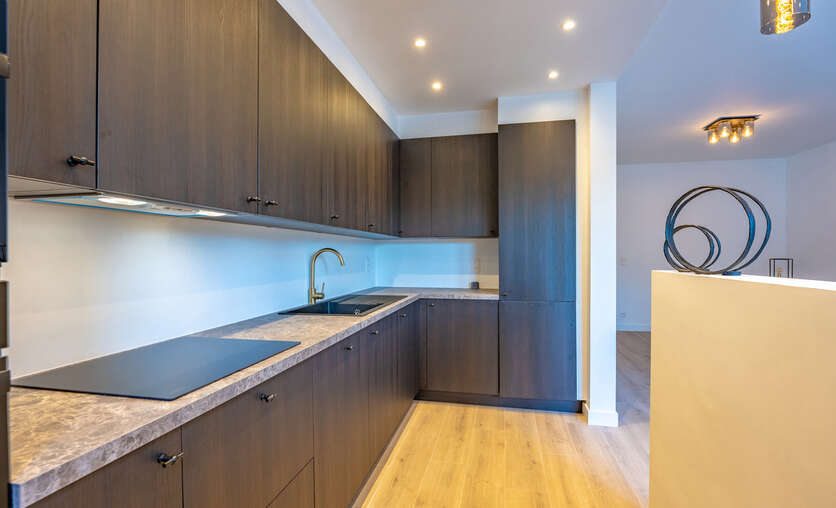 gelijkvloers: inkomhal met apart toilet, living met zicht op tuin en nieuwe open keuken voorzien van alle toestellen.
